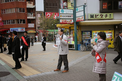 | 秘密保護法の危険性を知らせる宣伝。日本共産党県委員会の 松田書記長、味口市議らとともに=11月28日、神戸市元町 |