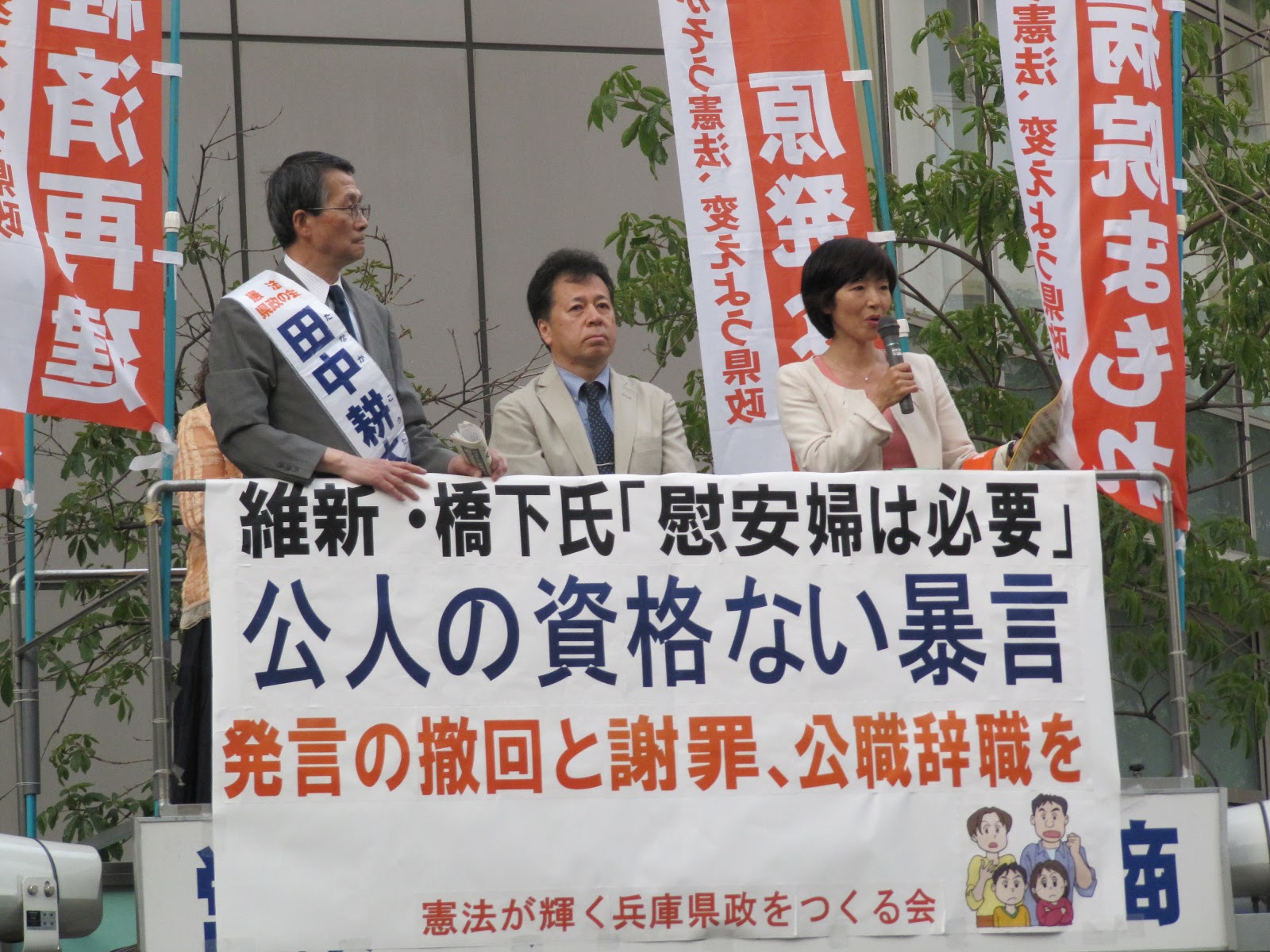 | 5月16日憲法県政の会の抗議宣伝に参加。左から田中耕太郎知事選予定候補、 石川康宏神戸女学院大学教授・憲法県政の会代表理事、きだ。石川先生は、慰安婦問題に詳しい。 |