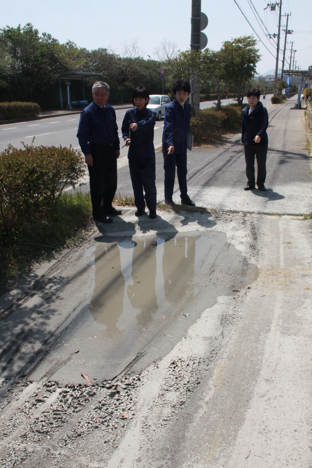 うそ!こんな風に隠すのかと肌寒い思いをしました。当然、手をあげ、前日に視てきた外構の損傷などの被害を発言しました。すると、そのことは認め駐車場にも亀裂が入っていたことも報告されました。私が言わなければ、「被害なし」で議会での報告が済んでいたのかと思うと、ぞっとしました。