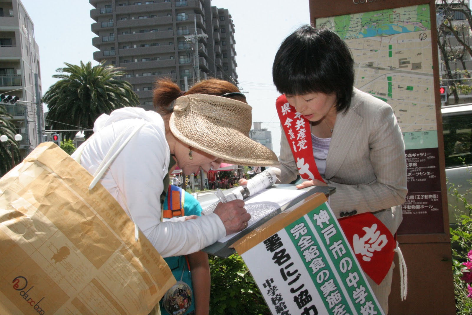 おいしくて栄養のある給食を中学校でも実現させましょう。 私の左は娘さんと参加された西区の花房史子神戸市議。 |