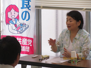 署名運動の呼び掛け人、参加団体などを確認したあと、私からは簡単に、学校給食の変遷、県の中学校給食に対しての姿勢、選択制でなく全員が食べる給食の実現などを、市会議員の松本のり子さんからはこの会が行われるまでの経過、市会の文教経済委員会でのやりとりなどをそれぞれ話し、そして交流しました。