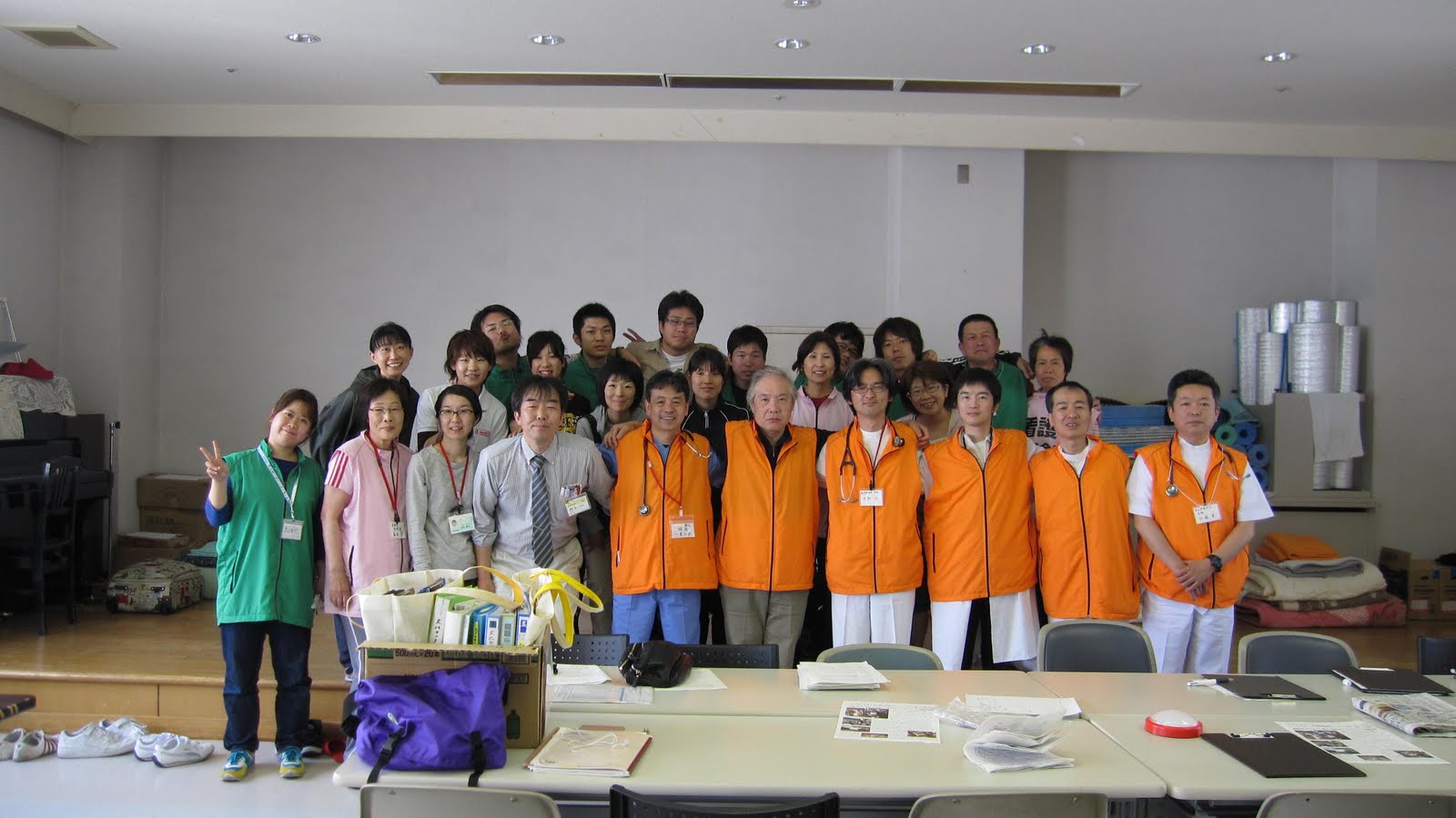 | 今回、支援活動にあたった全国の民医連の仲間です。 2列目の少し左側に私が写っています=坂総合病院内の支援センターで |