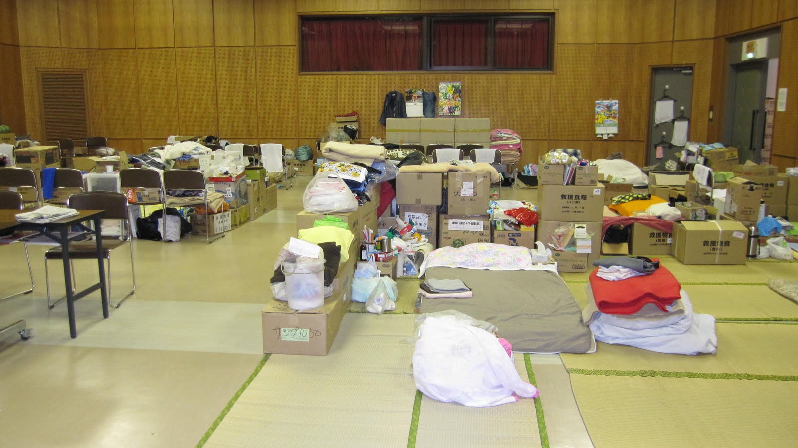 お伝えするのが遅れましたが、下の写真にあるように、この避難所は間仕切りすらなく、段ボール箱を置いただけで生活スペースを作っています。床は畳のように見えますが、ゴザが敷いてあるだけ。プライバシーが全くなく、、固くて冷たい床の上の生活では、健康を維持するのは難しいです。